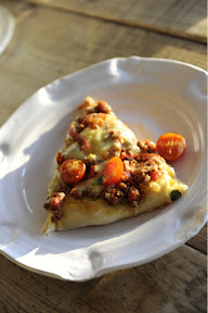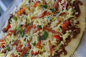 Trykk deigen ut på bakepapir, og har du tid kan du la den heve litt før du hiver på fyllet. Først kjøttsausen, deretter de øvrige ingrediensene. Jeg foretrekker å ha osten på toppen så unngå man at noe svir seg. Stek på 225 grader i 15 minutter - til bunnen er sprø og osten gyllen.
