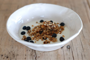 Etter å ha laget Nigellas fantastiske granola noen ganger har jeg funnet ut at denne er omtrent min egen. Jeg tar havregryn og det jeg ellers måtte ha tilgjengelig i kjøkkenskapet. Det blir nydelig det også. Granola er så godt at man kan godt spise det som dessert. Og selv om det ikke er aldeles sunnhetsprofeti eller lavkarbo, synes jeg man godt kan unne seg det i ferien i alle fall. Eller resten av året i moderate mengder. Med yoghurt!